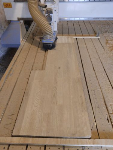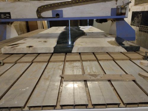 Sometimes wide boards that weren’t stored properly can also cup. In this case, a client started making a shelf out of a wide glued board and left it in the basement for almost a year. The only way to get it flat was using a CNC with a specialized bit as it was too wide for any type of planer.